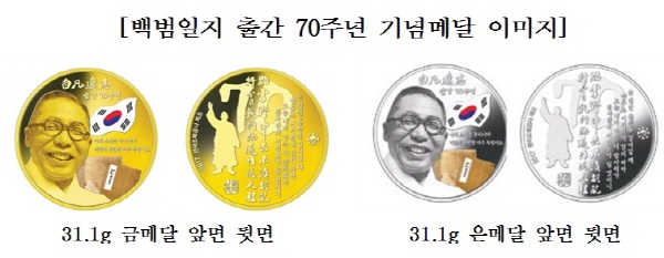 31.1g 금메달과 은메달 앞면에는 ‘白凡逸志 출간 70주년’ 명문과 함께 태극기를 배경으로 환하게 웃고 있는 김구 선생의 초상, 백범일지 초판본 <나의 소원>에서 발췌한 “나의 소원은 우리나라 대한의 완전한 자주독립이오”라는 문구를 새겨 구국의 메시지를 전달하고 있다.