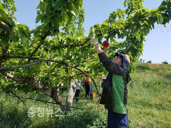 충남도교육청(교육감 김지철) 직원 50여 명은 19일 본격적인 영농기를 맞아 일손이 부족한 홍성 지역 과수농가를 방문해 배 적과 작업 등 봉사활동에 나섰다.
