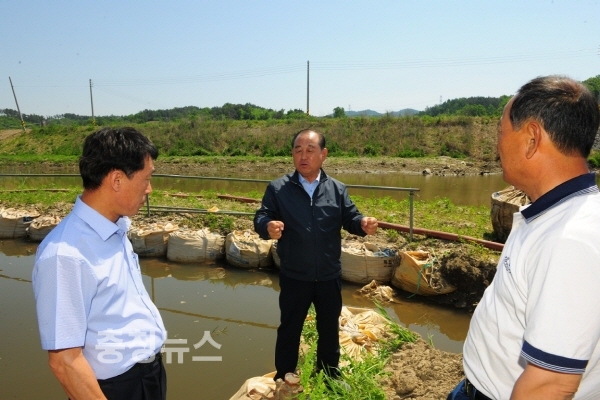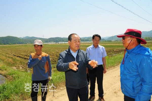 황선봉 군수가 가뭄 현장 및 저수지 등을 방문해 가뭄피해 현황을 살펴보고 있다