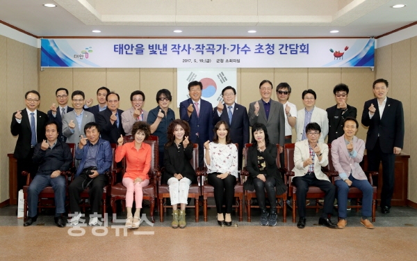 충남 태안군은 19일 군청 소회의실에서 한상기 군수를 비롯한 군 관계자와 태안을 노래한 작사가·작곡가·가수 16명 등 30여 명이 참석한 가운데 ‘태안을 빛낸 작사·작곡가·가수 초청 간담회’를 가졌다고 밝혔다.