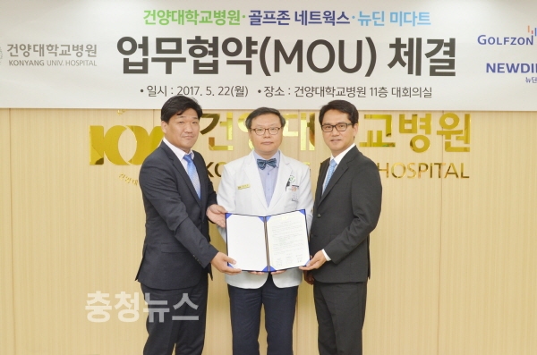 골프존네트웍스와 뉴딘미다트는 22일 대전 서구에 위치한 건양대학교병원(병원장 최원준)과 ‘장애아동 재활 치유 업무 협약 MOU’를 맺었다.