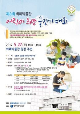 한국조폐공사(사장 김화동)는 가정의 달 5월을 맞아 어린이에게 꿈과 희망을 심어주기 위해 오는 27일 오전 11시부터 오후 3시까지 화폐박물관(대전시 대덕연구단지 소재) 광장에서 ‘제3회 어린이 희망 글짓기 대회’를 개최한다.