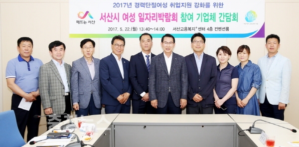 이완섭 서산시장이 2017 서산시 여성일자리박람회에 참여한 기업관계자와 간담회를 열고 지역의 우수 인재 채용에 힘을 보태줄 것을 당부하고 있는 모습