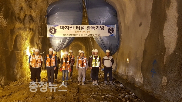 한국철도시설공단 수도권본부(본부장 이현정)는 ‘경원선 동두천∼연천 복선전철 건설사업’ 구간 중 2개의 시·군(동두천시, 연천시)에 걸쳐 통과하는 마차산 터널(연장 2.795km, 단선)을 5월 23일 관통했다고 밝혔다.