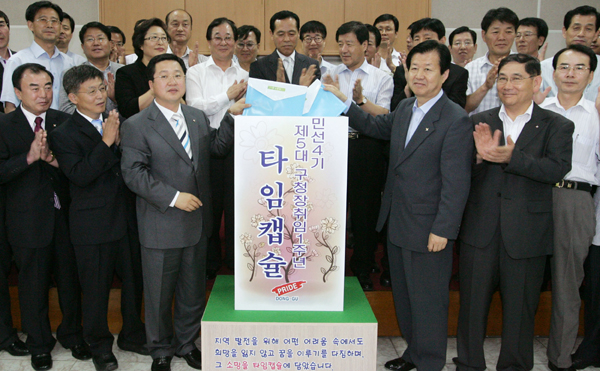 타임캡슐에 담은‘프라이드동구 희망메시지’는 동구의 현재와 미래의 만남을 주제로 △지역발전을 위한 나의 계획 △구정발전을 위한 비전과 성과 △본인발전을 위한 개인의 목표 △나·가족·동료에게 남기는 글 등의 내용으로 돼있다.