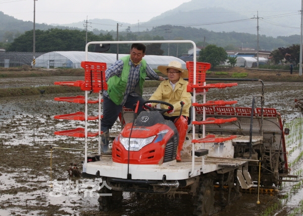 이석화 군수는 지난 24일 비봉면 록평리 하모(72)씨 2309㎡ 면적의 논에서 모내기 체험행사를 가졌다.