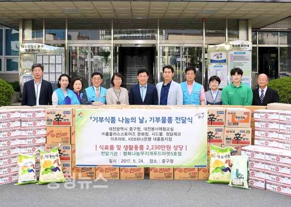 대전 중구(구청장 박용갑)는 결식문제를 겪고 있는 어려운 이웃의 건강한 식생활을 지원하기 위해 ‘기부식품 나눔의 날’을 운영하고 지난 24일 2230만원 상당의 기부식품 전달식을 개최했다.
