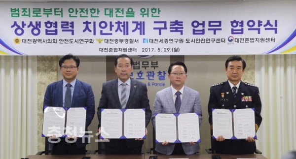 이에 29일 대전보호관찰소에서는 대전광역시 의회 안전도시연구회와 대전보호관찰소, 대전세종연구원 도시안전연구센터, 중부경찰서는 범죄로부터 안전한 대전 만들기를 위하여 지역사회 안전망 조성과 CPTED 교육 등 협력치안 체계 구축에 공동 노력하기로 하고 협약을 체결하였다.