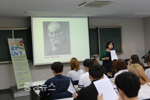기초교양대학 방민희 교수의 진행으로 개최된 이번 특강은 ‘광고 속의 詩, 내 마음 속의 詩’라는 주제로 국내외 광고 속에 등장하는 시를 소개하고 교수와 학생이 함께 토론하는 활동으로 이루어졌다.