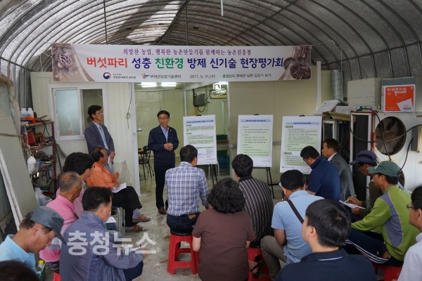 충남 부여군농업기술센터(소장 최석우)는 지난 달 31일 남면 신홍리 버섯 농가 재배사에서 ‘버섯파리 성충 친환경 방제용 천연 살충제 달마시안제충국 가열 연무’ 신기술 현장실증시험에 대한 현장평가회를 국립원예특작과학원과 공동 개최했다.