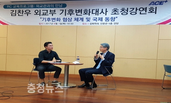 선문대는 지난 1일 성화학숙(기숙사) 강당에서 200여 명의 입주생이 참석한 가운데 김찬우 외교부 기후변화대사를 초청해 ‘기후변화 협상 체계 및 국제 동향’이라는 주제로 특강을 개최했다고 2일 밝혔다.