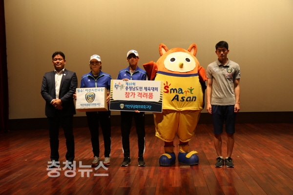 아산무궁화프로축구단은 2일 아산시청 시민홀에서 진행된 ‘제69회 충청남도민체육대회 아산시선수단 결단식’에서 아산시 선수단의 선전을 기원하며 격려품을 전달했다.