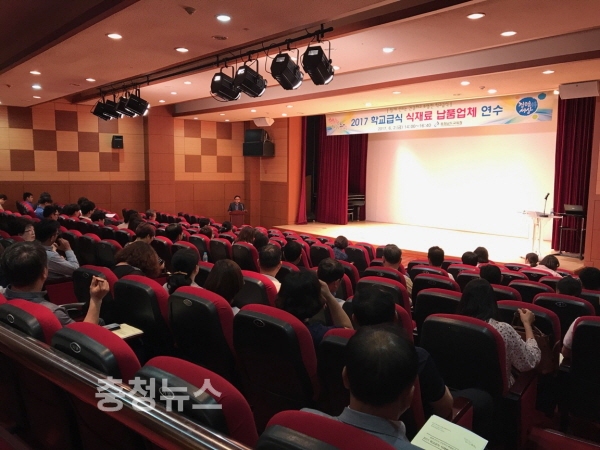 충남도교육청(교육감 김지철)은 2일 충남 관내 학교급식 식재료 납품업체 대표자 및 학교급식지원센터 관계자 100명을 대상으로 청양문화예술회관에서 학교급식 식재료 납품업체 연수를 실시했다.