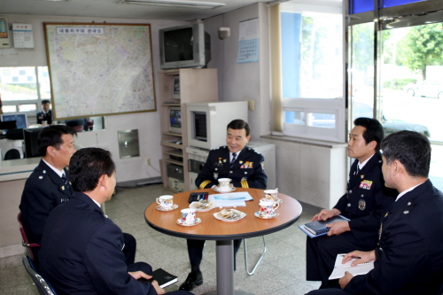 중부서 방문시에는 맨 먼저 중부경찰서 서대전지구대를 방문하여 “실질적으로 민생치안을 담당하고 있는 부서는 지구대”라면서 노고를 치하하고 격려하였으며 “맞춤형 도시경찰로 태어날 것을 당부”한 후 안정된 치안을 이끌고 있는 서장 이하 중부경찰서 전 직원들의 노고를 치하하고 격려하였다.