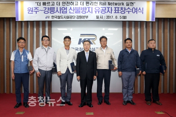 한국철도시설공단 강영일 이사장은 지난달 6일 강릉지역에서 발생한 대형 산불을 조기에 진화하여 원주∼강릉철도 시설물 보호에 기여한 현장 유공자에게 5일 표창을 수여하였다.