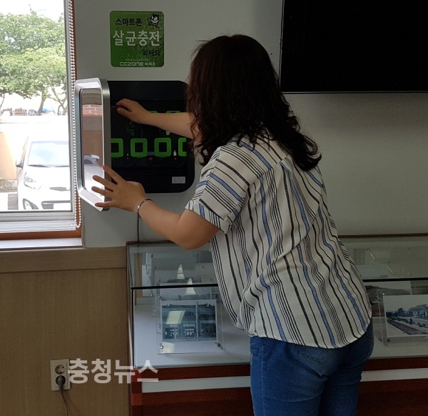 삽교읍행정복지센터는 민원인들의 편의 도모를 위해 스마트폰을 살균·충전할 수 있는 스마트폰 살균 충전기를 민원실에 비치하고 스마트폰 무료 충전 서비스를 제공한다고 5일 밝혔다.