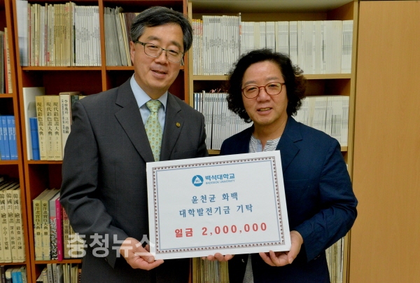 백석대학교(총장 최갑종)에서 지난 4월 3일부터 15일까지 2주간 ‘아름다운 강산’이라는 주제로 전시회를 열었던 산당 윤천균 화백이 5일 오전 10시, 교내 대학발전기금관리팀 사무실에서 대학발전기금 200만원을 기탁했다.