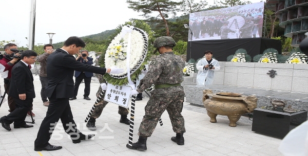충남보훈공원에서 열린 이날 추념식은 안희정 지사와 김지철 도교육감, 김재원 도 경찰청장, 전몰군경유족회 등 9개 보훈단체장 및 보훈가족 등 800여 명이 참가한 가운데 열렸다.