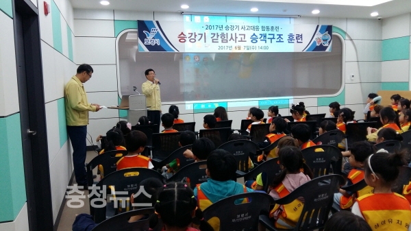 충남 보령시는 지난 7일 오후 CCTV 통합관제센터에서 시 공무원과 보령소방서, 승강기안전관리공단, 승강기 유지보수 업체, 어린이집 원생 등 100여 명이 참여한 가운데 2017년 승강기 사고대응 합동훈련을 실시했다.