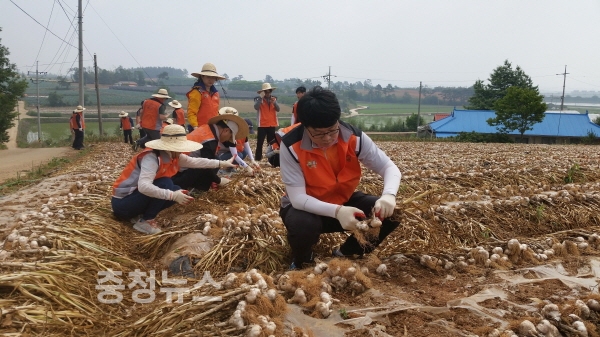 농협 충남지역본부(본부장 유찬형)는8일 계속되는 가뭄현상으로 예년에 비하여 5일정도 마늘캐기를 서두르고 있는 태안지역 마늘농가를 찾아 충남농협과 태안 관내 임직원 50여명은 「농촌사랑봉사단」을 구성하여 마늘줄기 절단 및 선별작업 등 바쁜 농촌일손을 도왔다.