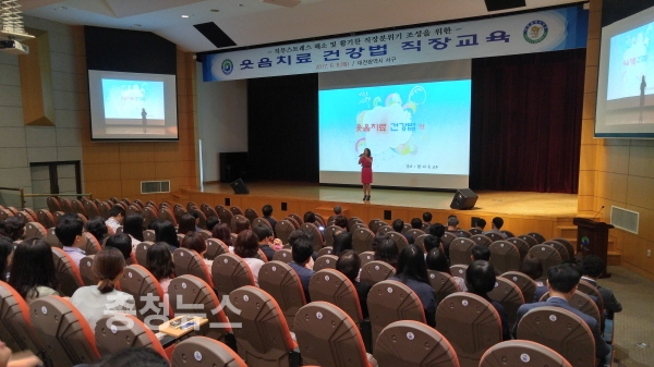대전 서구(구청장 장종태)는 8일 구청 대강당에서 장종태 서구청장을 비롯해 직원 400여 명이 참석한 가운데 ‘웃음 치료 건강법’ 교육을 했다고 밝혔다.