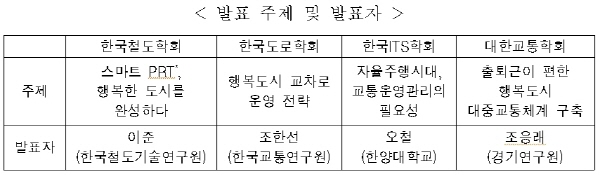 다음으로는 각 학회별 대표자들이 ‘행복도시의 미래 교통정책 방향’을 제안하는 주제발표 시간을 가졌다.