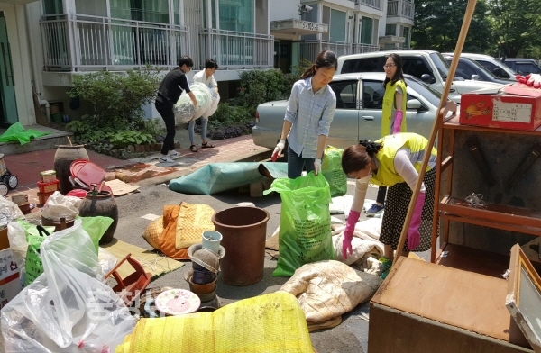 쓰레기 치우기와 대청소가 펼쳐진 9일 이른 아침 쾌청한 날씨만큼이나 동구희망복지지원단, 산내동 주민센터, 동구자원봉사센터, 산내주공아파트 관리사무소, 산내종합사회복지관 등에서 동참한 직원과 자원봉사자들은 밝은 표정 일색이었다.