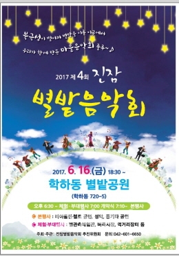 주민들이 제안하고, 직접 기획하여 만든 ‘2017 제4회 진잠 별밭음악회’가 오는 16일 유성구 학하동 별밭공원(학하동 720-5)에서 열린다.
