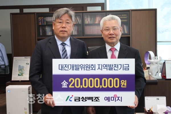 대전개발위원회 정성욱 명예회장(금성백조주택 회장)이 4차 산업혁명 특별시를 만드는데 개발위원회가 앞장서 달라며 강도묵 회장에게 지역발전기금 2,000만원을 전달했다.