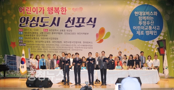도로교통공단 TBN대전교통방송(본부장 조신형)이 13일 대전광역시 교육청 대강당에서 교통안전공단 중부지역본부(본부장 권기동), 안전보건공단 대전지역본부(본부장 정성훈), 손해보험협회 중앙지역본부(본부장 박준규)와 교통 및 학교, 범죄, 보건, 환경 등 5대 안전 분야에서 어린이가 안전하도록 협력 및 지원에 앞장서기로 결의하고 기관별 다양한 어린이안전 방안을 논의해 실천하기로 합의하고 선포식을 가졌다.