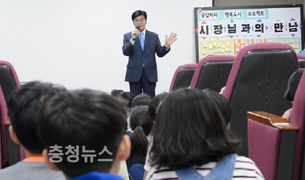 미르초 4학년 학생들이 보내온 정책제안 편지가 계기가 되어 마련된 이날 대화의 시간에서 이춘희 시장은 세종시의 탄생과정과 발전상 등을 학생들의 눈높이에 맞게 설명했다.
