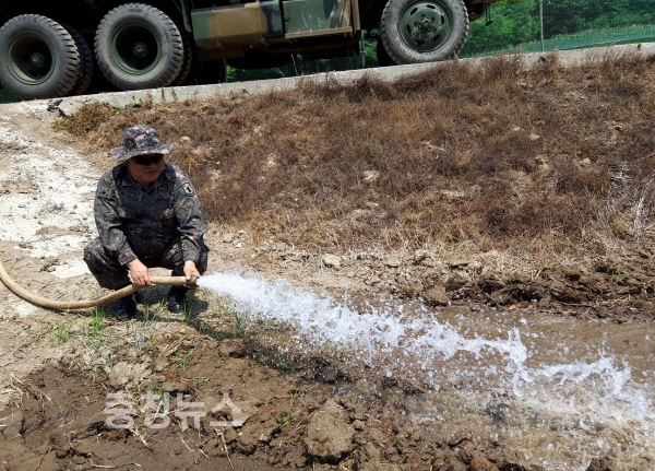 이에 군은 지난 13일부터 15일까지 3일간 1789부대 4대대의 사단 화학지원대 급수 차량 3대와 보명레미콘의 차량 10여대 및 용수를 지원받아 신양면 대덕리와 시왕리, 불원리, 녹문리, 여래미리 등의 가뭄 현장에 농업용수를 공급하고 있다.
