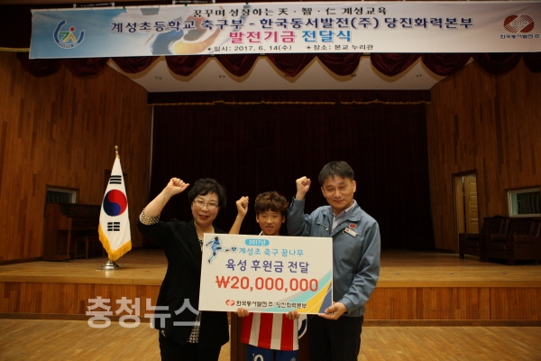 한국동서발전(주) 당진화력본부(본부장 박상준)는 14일 당진 관내 계성초, 신평중을 방문해 유소년 축구 꿈나무 육성을 위한 후원금 전달식을 가졌다고 밝혔다.