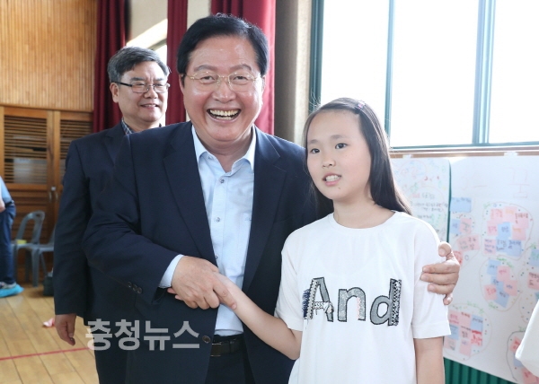 100인의 어린이 원탁회의에 참석한 장종태 구청장이 어린이와 포즈을 하고 있다.