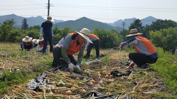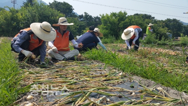 충남농협 임직원과 공주시지부, 류병관 충남노조 지역위원장 등 농촌사랑 봉사단 40여명은 폭염주의보 속에서 양파수확에 구슬땀을 흘리며 뜻깊은 농촌사랑 나눔봉사 활동을 펼쳤다.