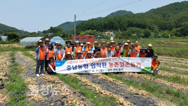 농협 충남지역본부(본부장 유찬형)는 지난 17일 공주시 계룡면 중장리 양파재배 농가를 찾아 양파 수확 일손을 도왔다.