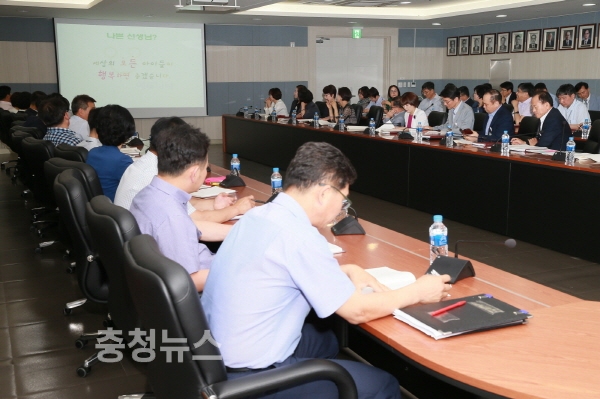 충남도교육청(교육감 김지철)은 19일 도교육청 제1회의실에서 장학관, 장학사 81명이 참석한 가운데 부서간 소통과 협업 활성화를 위한 토론회를 개최했다.