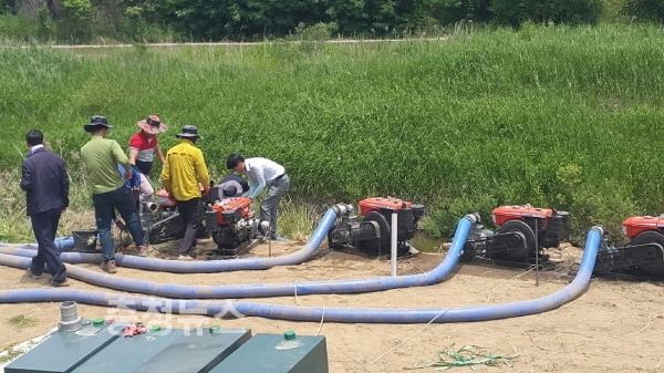 목면 치성천 하류에서 양수기 4대 동원 1일 6천㎥의 물 끌어와