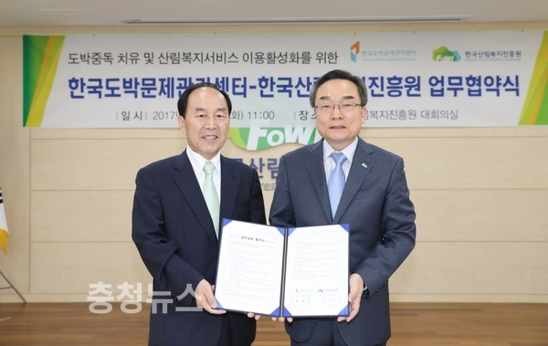 산림청 한국산림복지진흥원(원장 윤영균)은 20일 한국산림복지진흥원 대전 사무처 대회의실에서 한국도박문제관리센터(원장 황현탁)와 도박중독 치유 및 산림복지서비스 이용활성화를 위한 업무협약(MOU)을 체결했다고 밝혔다.