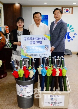 충남 홍성군(군수 김석환)은 군청, 읍·면사무소에서 “공유(양심)우산 서비스”를 운영하여 민원인에게 편의를 제공과 고객만족 감동 행정에 앞장서고 있다.