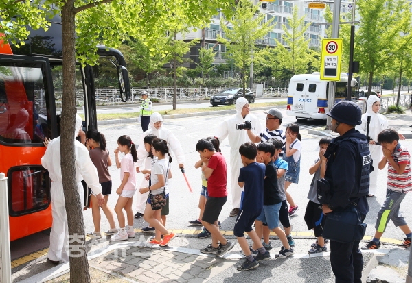 ‘2017년 유성구 방사능방재 주민보호훈련’을 실시한 가운데 학생들이 구호소로 이동하기 위해 버스에 타는 모습