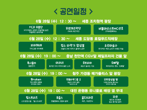 그리고 세종 로컬푸드직매장에서는 피아체레, 림스 타악기 앙상블, 조선마술사의 공연과 마지막으로 대전 은행동 유니클로 옆 매장에서는 팀 스트리츠, 뮤즐스, 콜드 브라운, 자코의 공연 등 청춘들의 열정을 담은 다채로운 무대가 곳곳에서 펼쳐진다.