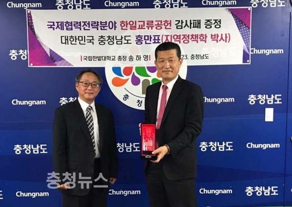 한밭대학교(총장 송하영)는 지난 23일 충남도청에서 국제통상실 아주팀장 홍만표 박사에게 감사패를 전달했다.