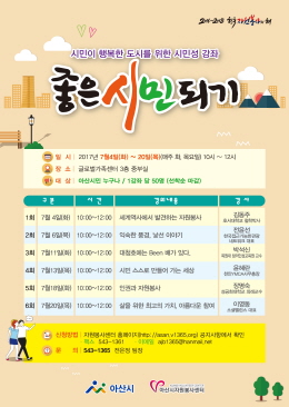 충남 아산시자원봉사센터(센터장 박광순)는 오는 7월 4일부터 20일까지 총 6회(매주 화, 목)에 거쳐 글로벌가족센터 3층에서 시민이 행복한 도시를 위한 ‘좋은 시민 되기’강좌를 개최할 예정이다.