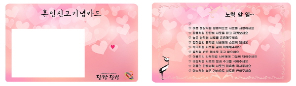 카드발급 절차는 혼인신고 시 신청하면 민원실 내 설치된 포토존에서 부부사진 촬영을 한 뒤 민원위생과에서 제작해 직접 교부하거나 등기로 발송해 주며, 발급비용은 무료다.