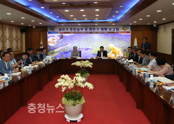 2017년 ‘넘버원 청양 행복한 군민 실현’을 목표로 쉼 없이 달려온 청양군이 27일 군청 상황실에서 상반기 주요업무 추진실적 및 하반기 계획 보고회를 개최했다.