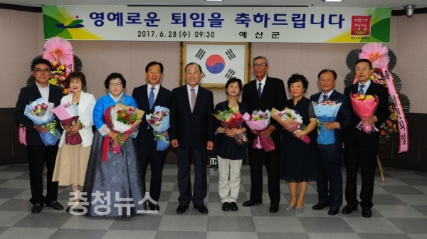 올해 6월 30일 자로 정년을 맞아 퇴직하는 공직자는 최찬식 대술면장, 강윤구 전문위원, 한길전 농업기술센터소장, 김중복 농업기술센터 기술보급과장, 이민호 예산읍 부읍장, 이광순 응봉면 부면장, 전영한 고덕면 부면장, 이찬희(예산읍), 엄태승(의회사무과), 이재복(예산읍), 김온숙(보건소), 김원태(보건소), 배기환(예산읍), 도세현(예산읍, 미화원), 정문식(예산읍, 미화원), 박영찬(고덕면, 미화원) 등 16명이고 명예퇴직자는 이흥엽 총무과장이며 최동학 전 삽교읍장과 이종숙(교육체육과) 등 2명이 공로연수에 들어갔다.