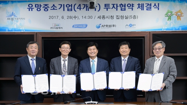 세종시(시장 이춘희)는 28일 시청 집현실에서 이춘희 시장과 유망 중소기업 4개사 대표 등이 참석한 가운데 투자협약을 체결했다.
