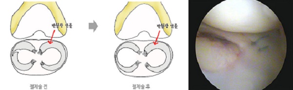 보존적 치료를 시행했음에도 불구 증상이 나아지지 않거나 초기 반원상연골판 손상이 심한 경우에는 관절경을 통해 연골판 복원술, 연골판 제거술 등을 시행하게 된다. 이 수술은 약 30 여분의 짧은 시간 내에 진단 및 치료가 가능하고 빠른 회복을 기대할 수 있다.