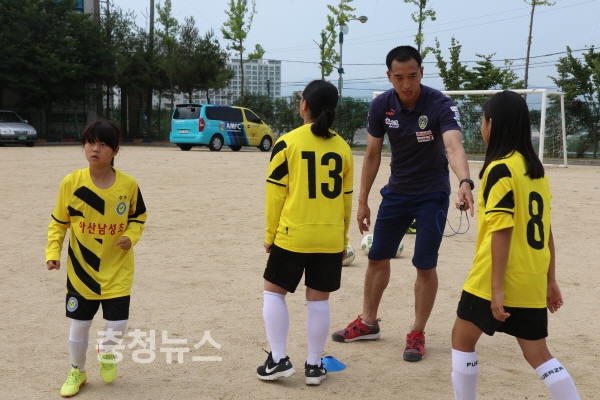 아산무궁화프로축구단 선수들이 남성초 여자 축구부 어린이들에게 직접 축구를 가르쳐 주며 의미 있는 시간을 보냈다.